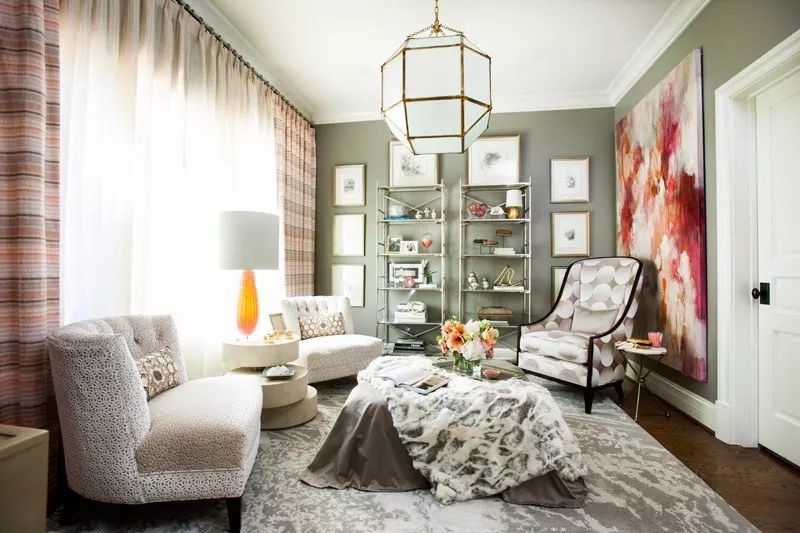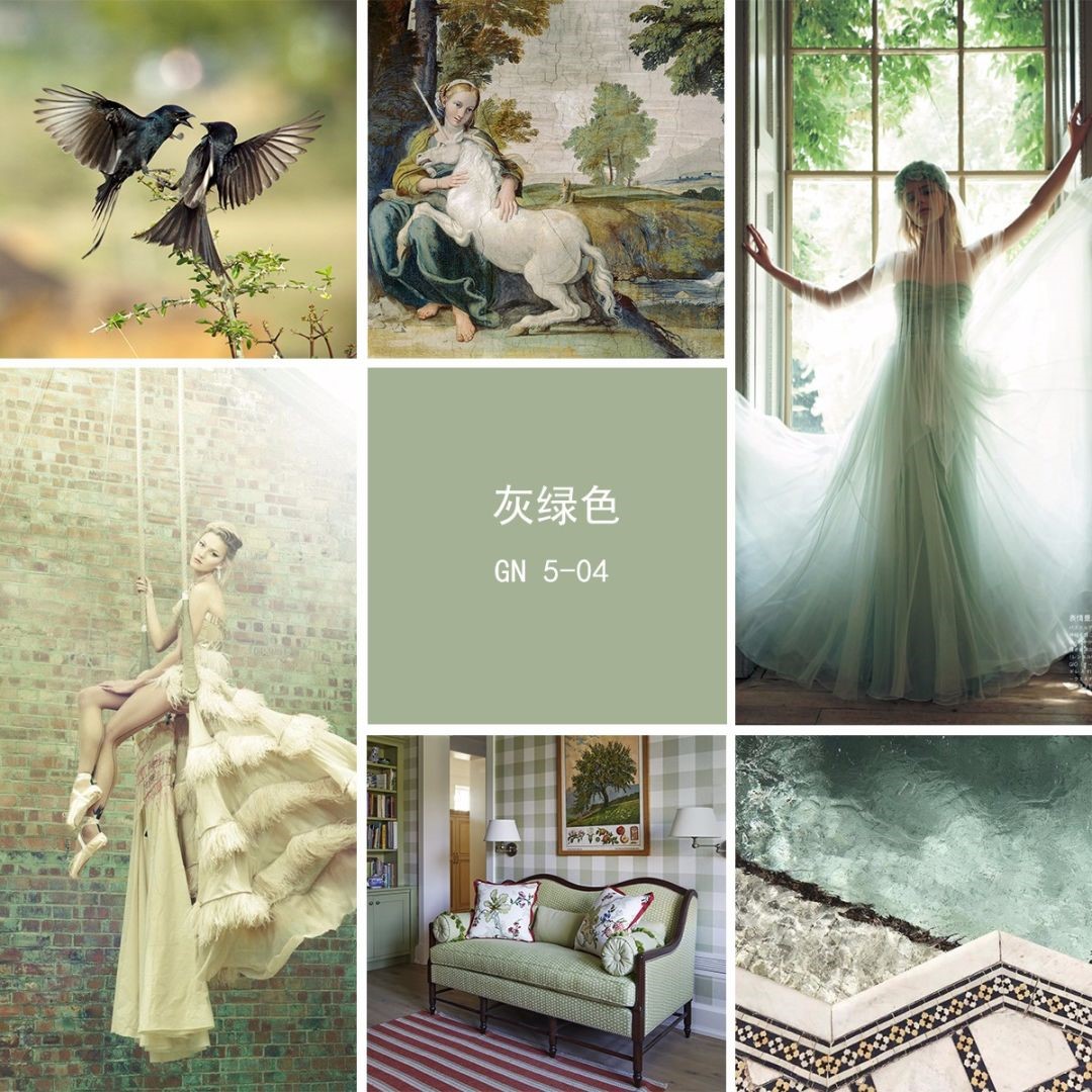 灰綠色可以搭配出靜謐而詩意的空間感覺,可以與黑白灰組合,像是在夢幻的世界,也可以和不同色階的綠色進行搭配,點綴金色,營造一個清新自然的環境。