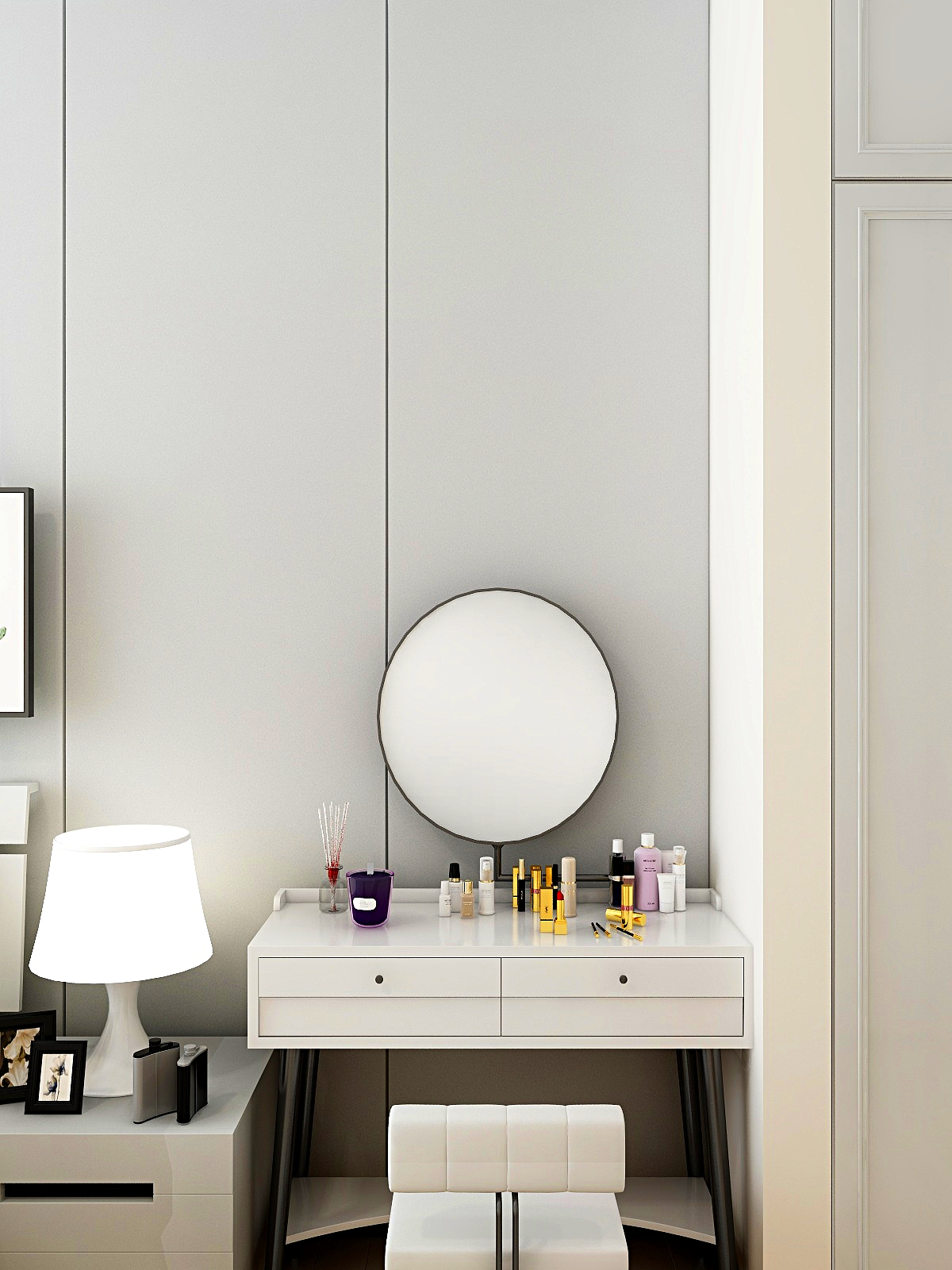 ——臥房簡潔,沒有多余的裝飾品,金屬的收邊條將背景板分割的條例清晰,像似一個立體的人兒,感性中帶著理性。