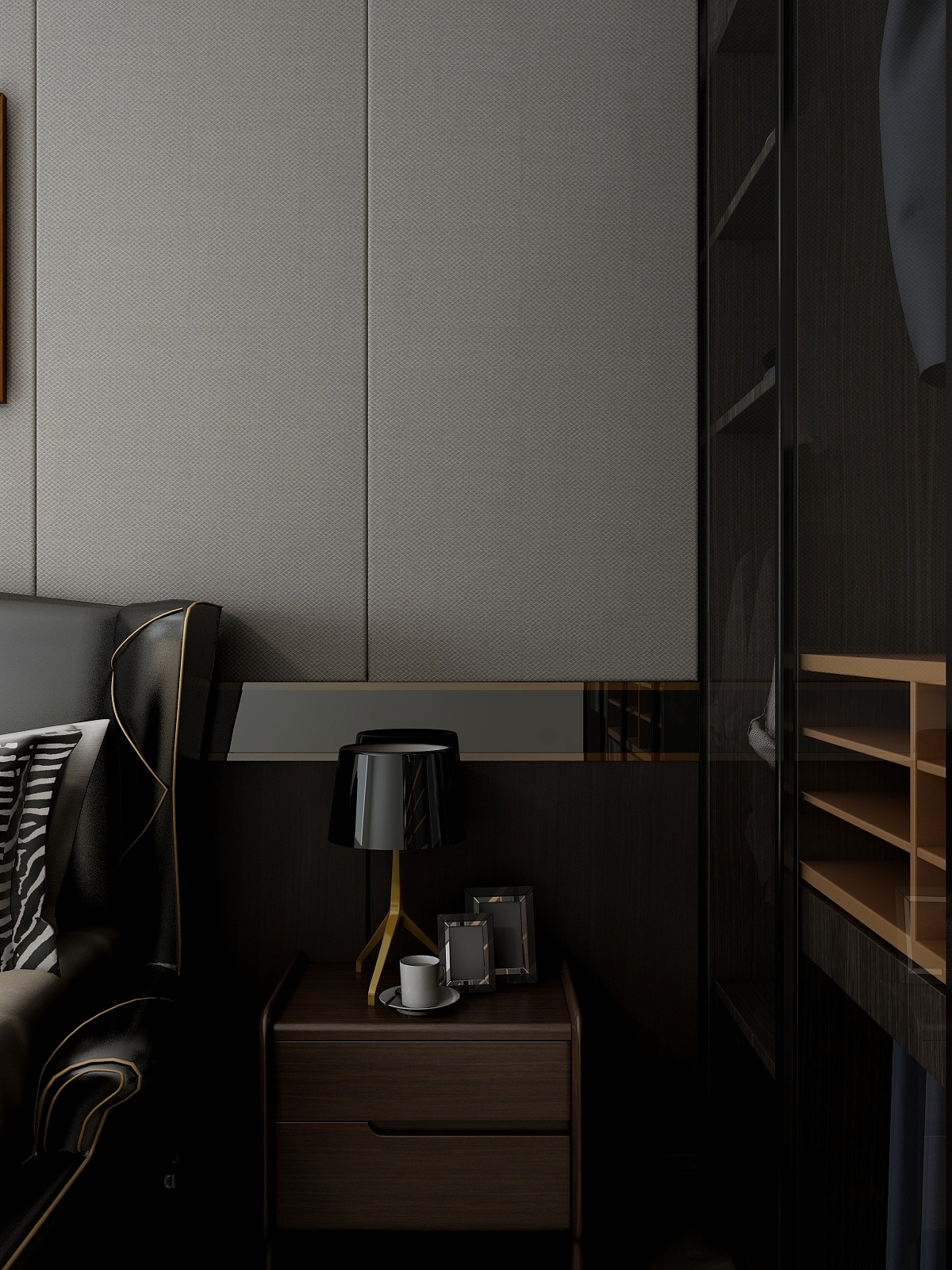 ——臥室亦采用了金屬邊的應用,木制衣柜與布藝背景板,以及床都用了材質的色彩,軟硬對比使空間富有層次感。