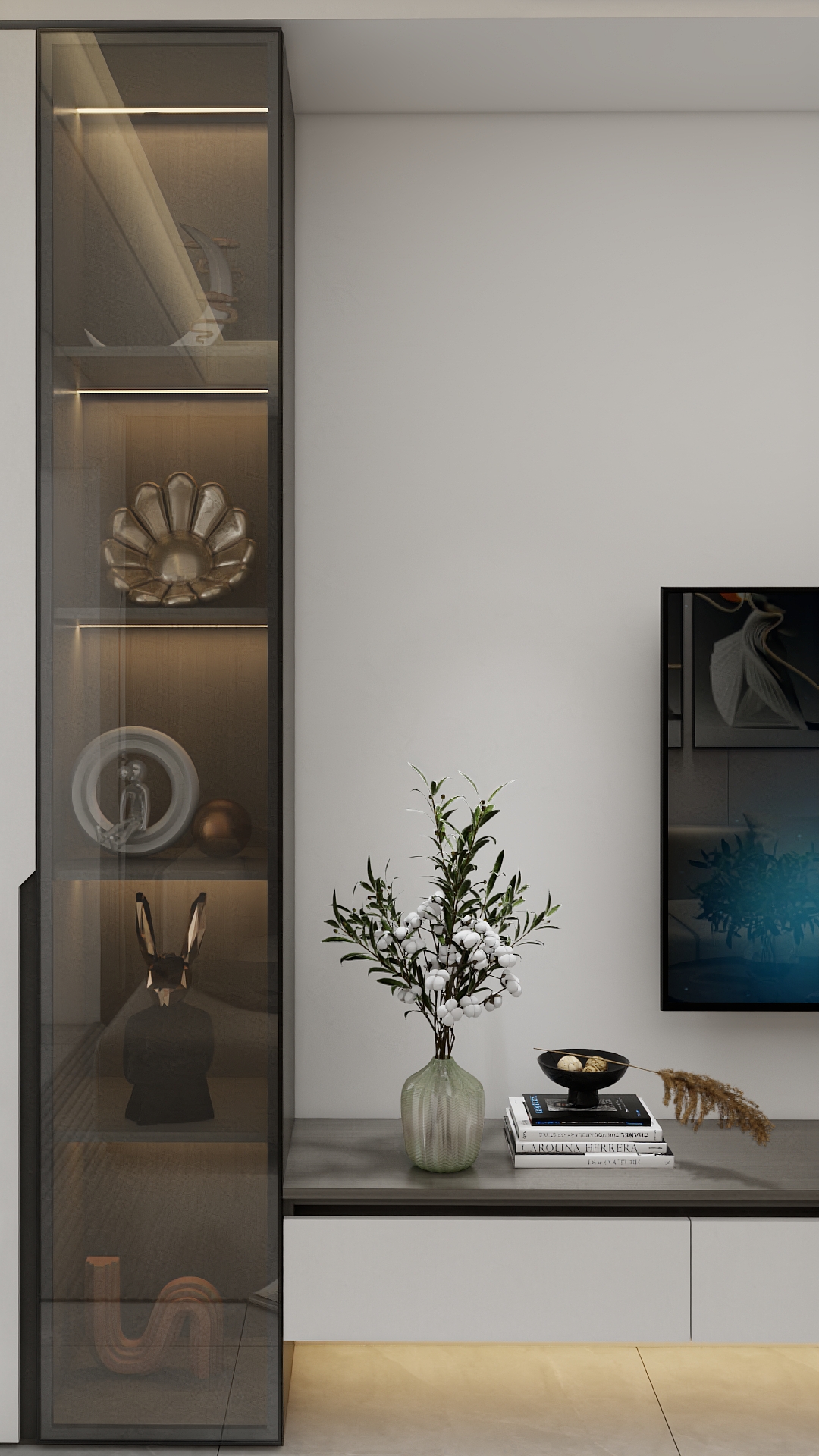 電視柜采用簡潔的線條和透明玻璃面板,不僅讓整個電視柜看起來更加輕盈現代,