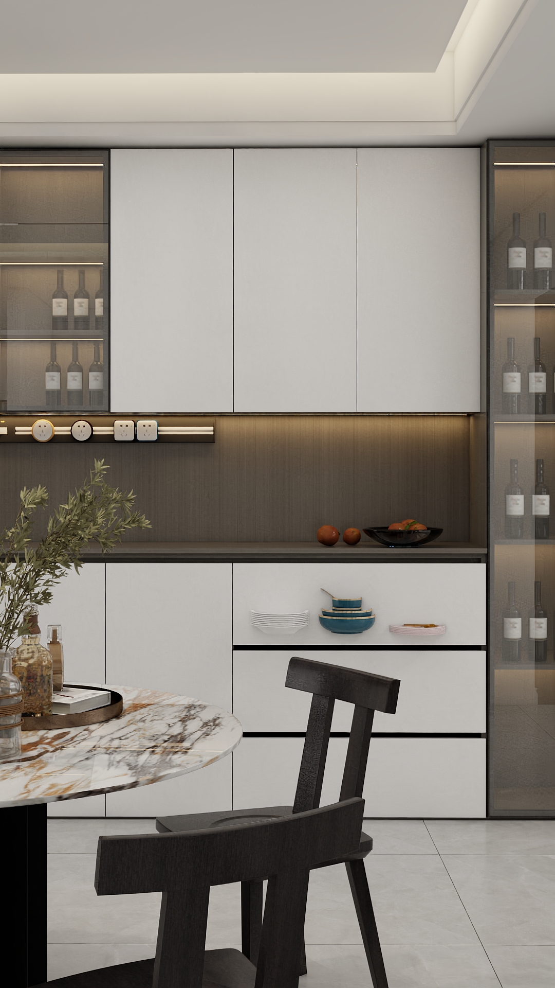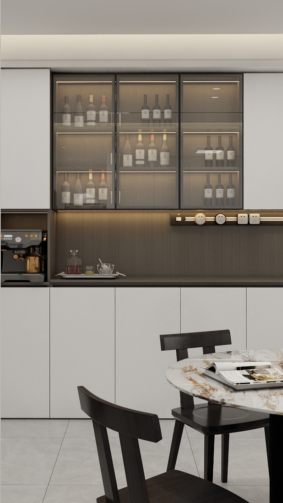 在這個設計中,金屬框架的線條簡潔而精致,與玻璃酒柜的通透感相得益彰,讓整體空間更加寬敞明亮。